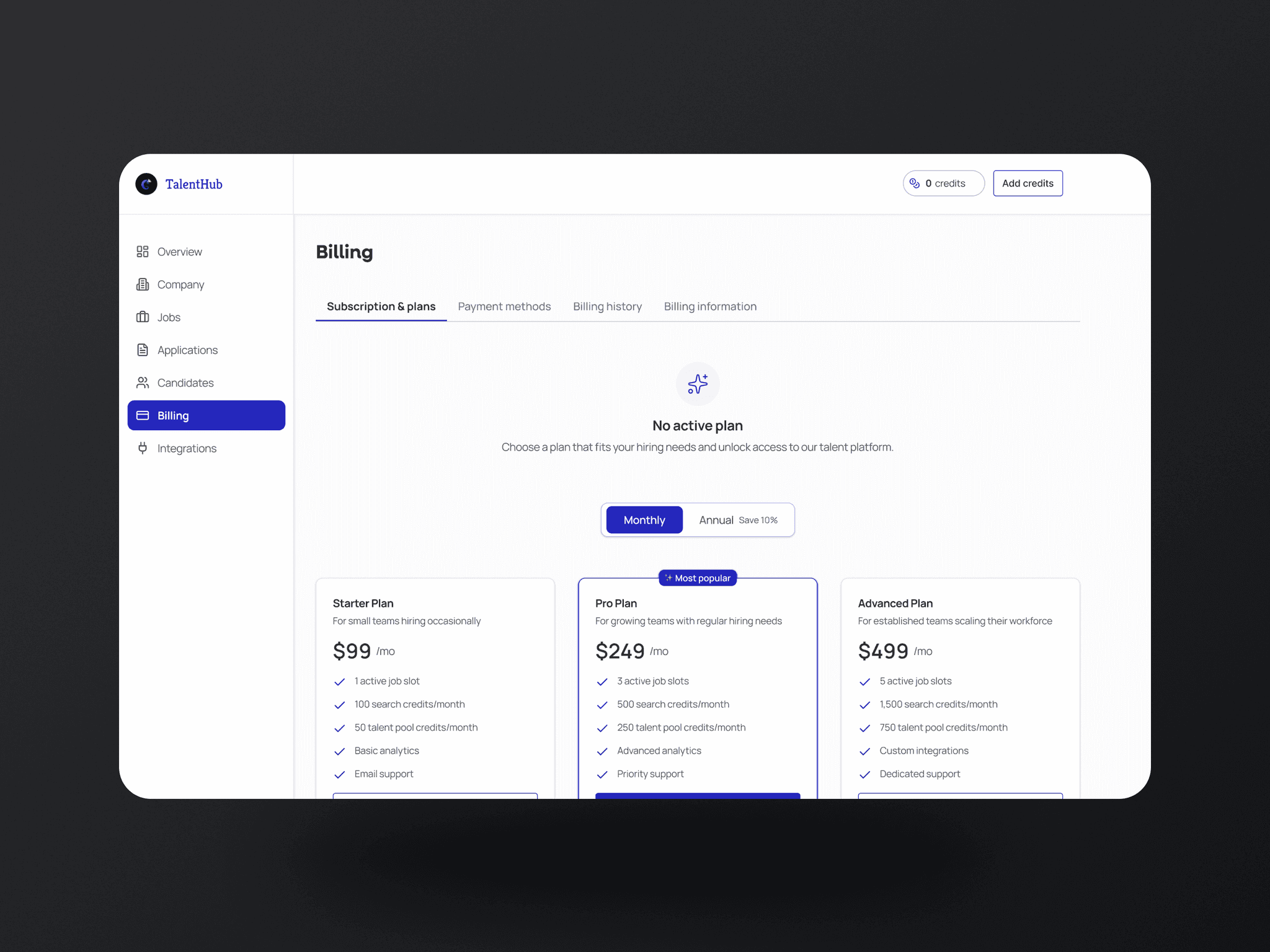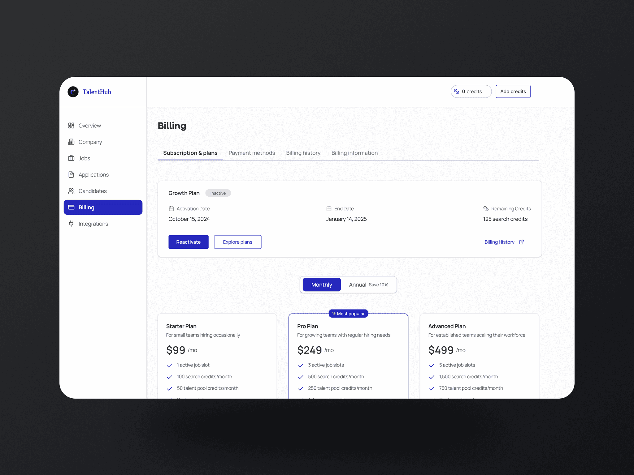 Plan details were difficult to compare, credit usage wasn’t intuitive, and the billing flow made it hard for users to upgrade confidently. I redesigned these areas with an emphasis on transparency, predictable user states, and clearer pathways toward growth.
